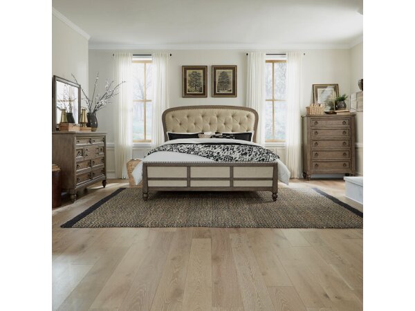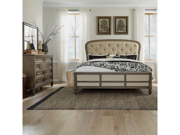 King Tufted Panel Headboard,King Uph Shelter Footboard,Shelter Bed Rails,9 Drawer Dresser,Landscape Mirror,5 Drawer Chest,2 Drawer Night Stand w/ Charging Station