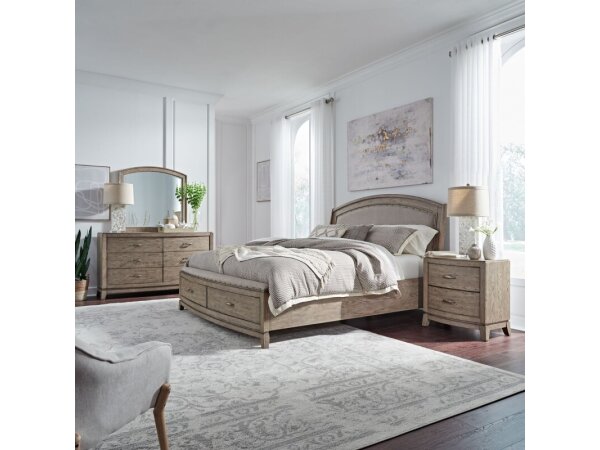 Queen Storage Footboard w/ Slatroll,Queen Upholstered Headboard,Storage Bed Rails,6 Drawer Dresser,Arched Mirror,5 Drawer Chest