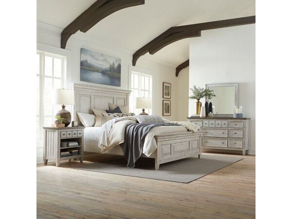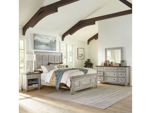 King Decorative Panel Headboard,King Panel Footboard,9 Drawer Dresser,5 Drawer Chest,Landscape Mirror,1 Drawer Night Stand w/ Charging Station,Panel Bed Rails