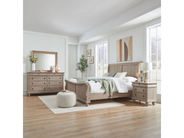 Outfit your bedroom with this five-piece set, including a king sleigh bed, dresser, mirror, chest, and nightstand. This collection is defined by its classic styling, featuring a roll-back sleigh headboard and felt-lined top drawers.