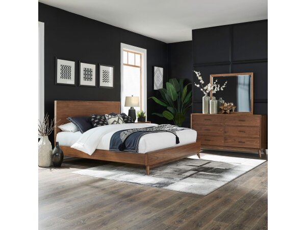This Queen platform bed set includes a dresser and mirror, offering a low-profile design that requires no box spring. The dresser features bronze bar pull hardware, metal side drawer guides, and premium felt and cedar lined drawers.