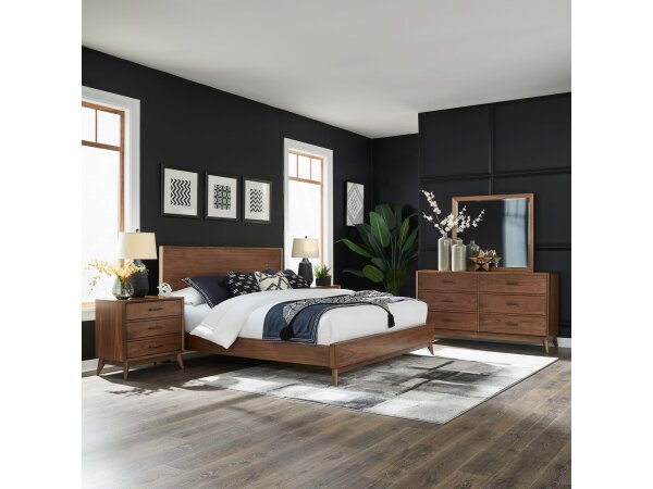 This bedroom set provides a complete room solution with a low-profile King platform bed, a dresser with mirror, and a matching chest. Storage pieces feature bronze bar pull hardware, felt-lined top drawers, and cedar-lined bottom drawers.