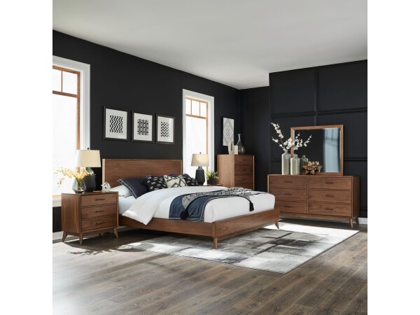 This Queen platform bed set includes a dresser, mirror, and chest, featuring a low-profile bed that requires no box spring. Storage pieces are equipped with bronze bar pull hardware, metal drawer guides, and premium felt and cedar lined drawers.