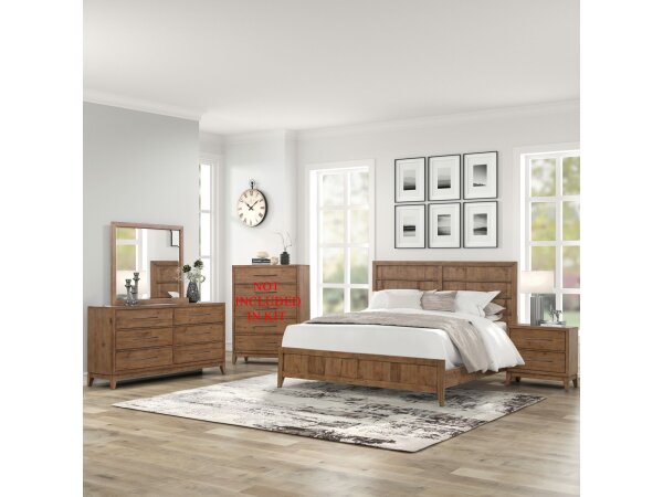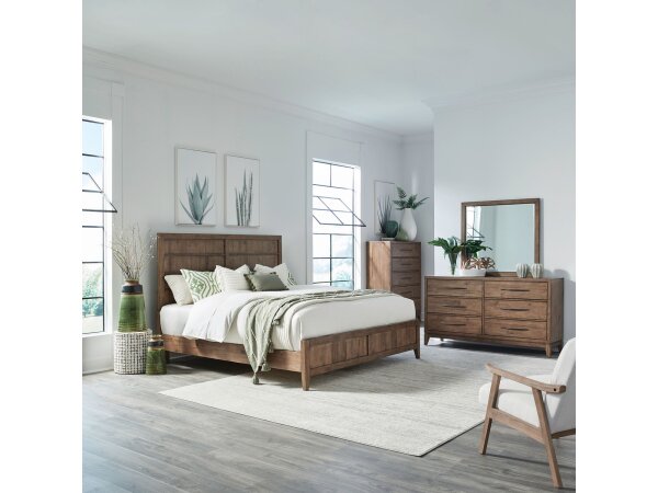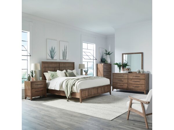 This complete bedroom set includes a queen panel bed, dresser, mirror, chest, and a nightstand with a built-in charging station. The convenient nightstand offers AC, USB-A, and USB-C ports, while the set shares features like premium drawer linings and bur