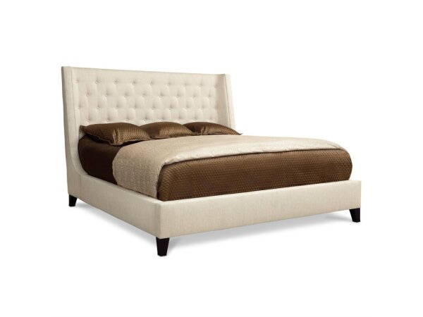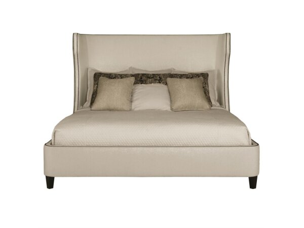 An elegant upholstered bed with wings and refined nailhead trim along the headboard, footboard and side rails.