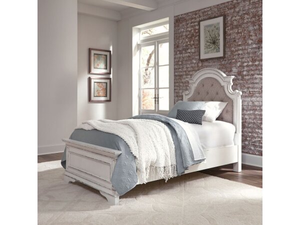 This Magnolia Manor daybed upholstered back features European traditional design with an antique white finish and heavy chipping. It is crafted from rubberwood solids with white oak and birch veneers, and boasts a button-tufted chenille fabric back with a