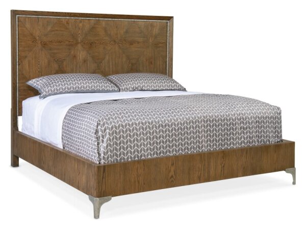 Queen panel bed in white oak veneers with a warm Sorrel finish and a diamond-pattern headboard. Hand-hammered pewter metal inlay and feet; includes headboard, footboard and rails.