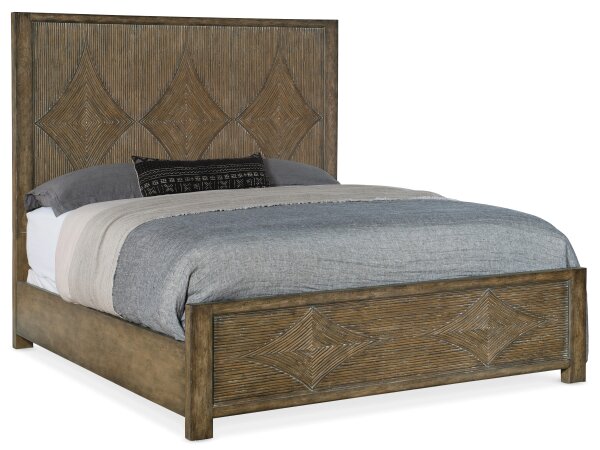 California king panel bed with a reeded diamond headboard and footboard in a light Driftwood finish. Pecan veneers and resin construction; includes rails and the headboard can be used alone.
