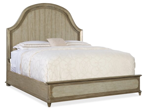 King panel bed with an arched headboard wrapped in textured, hammered metal, crafted of oak veneers and aluminum in a Sorrento taupe/gray finish. Includes headboard, footboard and rails; headboard adjusts 70-76 in.