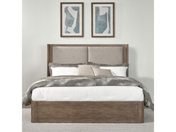 Two-tone gray washed oak and textured light gray King upholstered panel bed crafted with oak veneers and Macrame Artic fabric; includes headboard, footboard and rails. Headboard can be used alone.