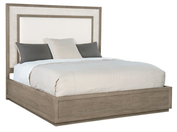 Two-tone gray washed oak and textured light gray King upholstered panel bed crafted with oak veneers and Macrame Artic fabric; includes headboard, footboard and rails. Headboard can be used alone.