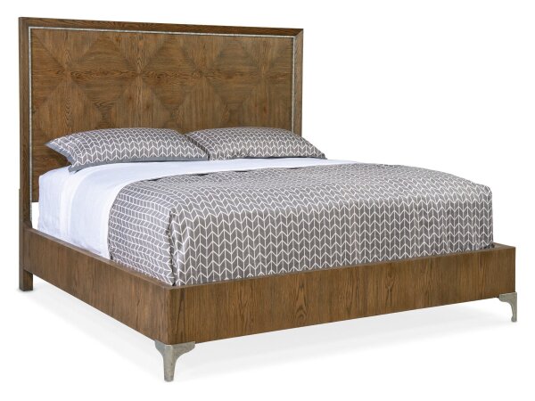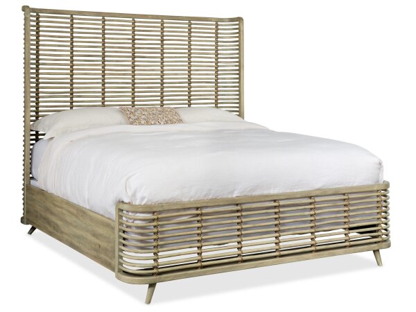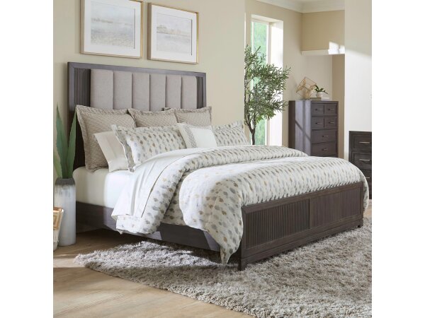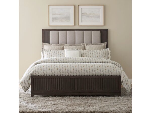 This Queen Shelter Bed features frosted beige upholstery, an arched upholstered shelter headboard, and elegant wood frame accents. Design details include channeled panels, a softly rounded cap rail, round pilasters, turned feet, and square bead molding.