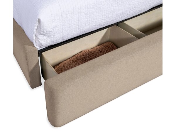 This king storage bed features a wood-framed headboard with an upholstered panel in oatmeal linen and nail head trim. The footboard includes a padded bench seat and cedar-lined drawers for convenient and protected storage.
