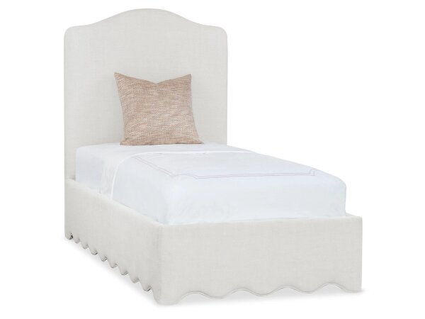A twin upholstered bed in 100% linen (Broadway Dune) with a fully upholstered frame and scalloped base for timeless, traditional style. Includes headboard, footboard, and rails.