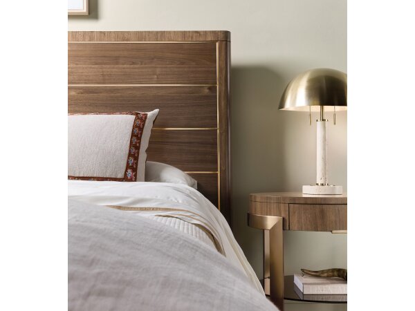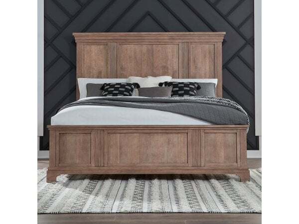 This king panel bed is built for stability with bolt-on rails and a center support slat system. Its design features clean, straight lines accented by a heavy step crown and reeded center mullions.