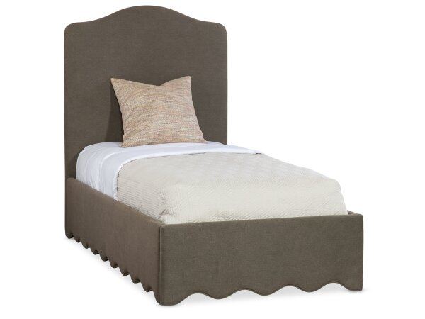 A warm twin upholstered bed in 100% linen (Broadway Coffee) featuring a fully fabric-wrapped frame and scalloped base for vintage-inspired charm. Includes headboard, footboard, and rails.