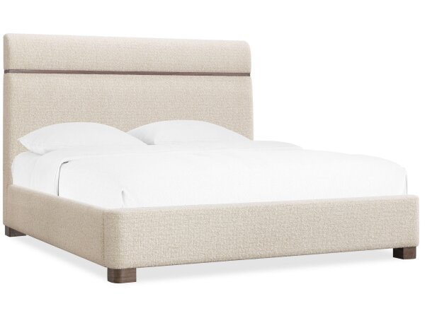 This king storage bed features a wood-framed headboard with an upholstered panel in oatmeal linen and nail head trim. The footboard includes a padded bench seat and cedar-lined drawers for convenient and protected storage.