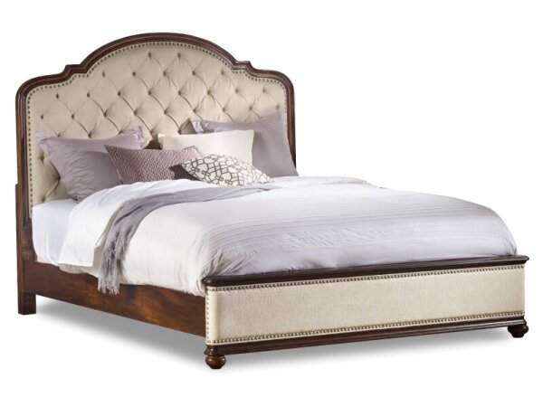 California King poster bed crafted of mahogany veneers with a rich traditional finish and light distressing, featuring an elegantly shaped headboard with cathedral and swirl veneers. Includes headboard, footboard, and rails; headboard can be used alone.