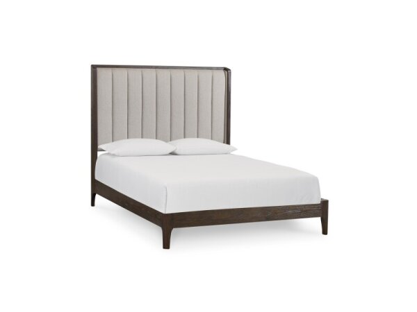 King poster bed with short posts, featuring a vertically channeled upholstered headboard and a rustic White Oak/Pine Knotty Oak veneer frame in a smoky Arabica finish. Includes headboard, footboard and rails.