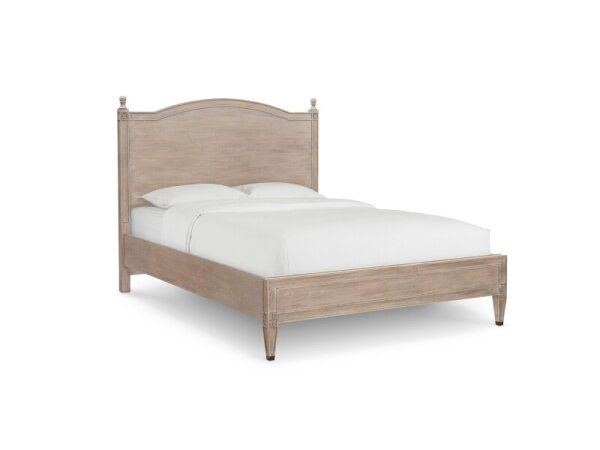 Classic panel bed with an arched wood headboard and low footboard, accented by carved rosettes and turned finials. Elm veneer highlights the grain in glazed, moderately distressed Tavern or Washed Elm finishes.