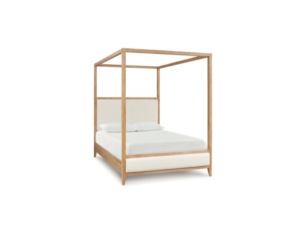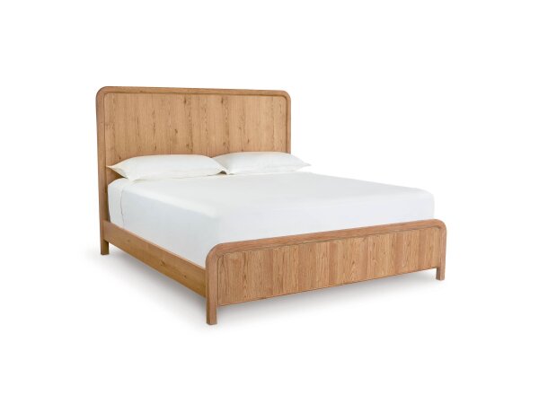 White oak panel bed with gently rounded corners on the paneled headboard and footboard. A tracing groove and clean-lined rails add dimension and modern, architectural appeal.