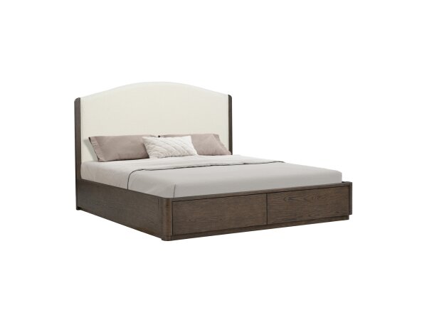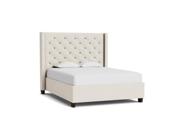 Tufted upholstered bed customizable in designer fabrics, with optional end-of-bed storage and choice of complete frame or headboard. No foundation required.