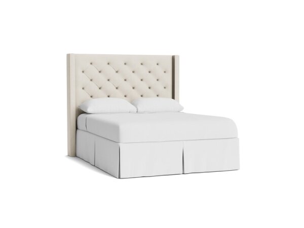 Tufted upholstered bed customizable in designer fabrics, available as a complete bed or headboard-only. The complete bedframe offers optional end-of-bed storage and is available in sizes Twin–Cal King.