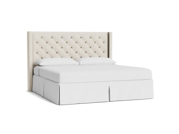 Tufted upholstered bed customizable in designer fabrics, available as a complete bed or headboard-only. The complete bedframe offers optional end-of-bed storage and is available in sizes Twin–Cal King.