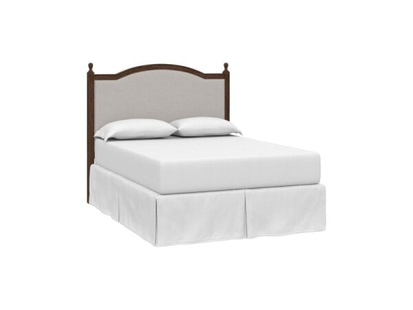 Queen upholstered bed with carved rosettes and turned finials, paired with a softly arched headboard in neutral Oatmeal. Elm veneer with modern Tavern or Washed Elm finishes.