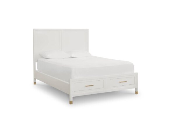 Hampton White storage bed featuring the Tidewater panel design with raised framing details. Integrated storage keeps the room tidy; no foundation required.