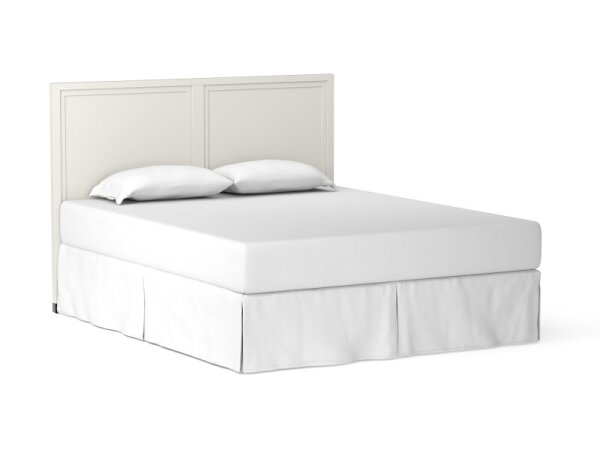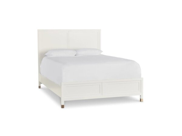 White panel bed with raised framing details and a smooth Hampton White finish. Streamlined legs feature satin brass metal ferrules for a refined, timeless look.