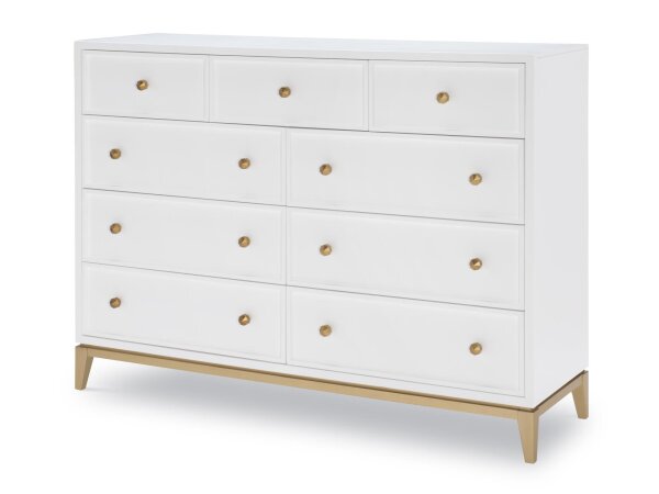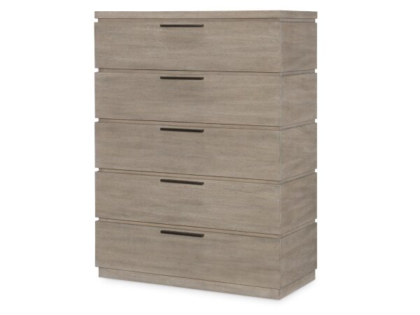 This urban-styled 5-drawer chest features a cobblestone finish, bottom case dust proofing, and picture-framed drawer fronts with canted molding. It is anchored by a tapered leg base and accented with antique brass hardware.