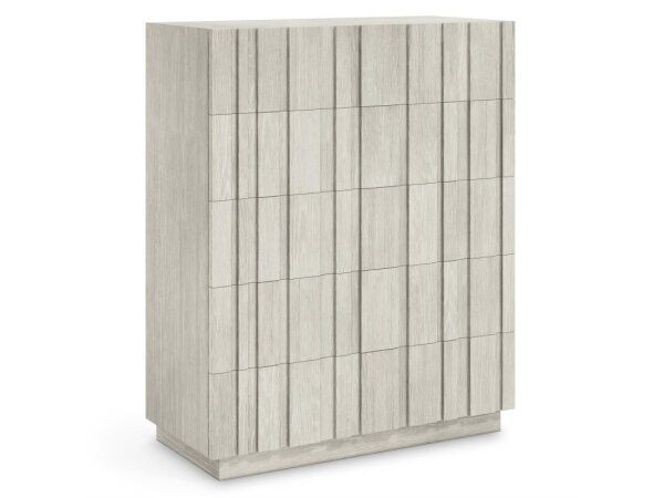 Tall six-drawer chest in oak veneers with reeded fronts and slender metal legs. Self-closing drawers include a removable top liner and a cedar-lined bottom for organized bedroom storage.