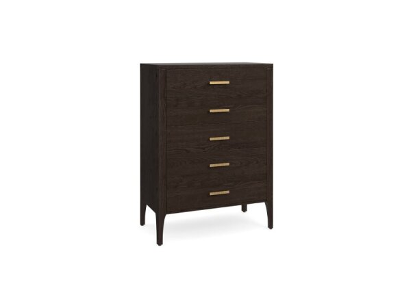 Scandinavian-inspired 5-drawer chest with two half drawers above three full, perched on rounded legs for clean, mid-century storage. American walnut veneer in a rich espresso finish.