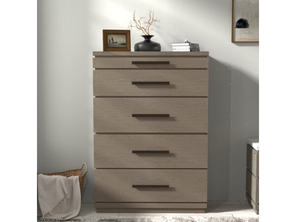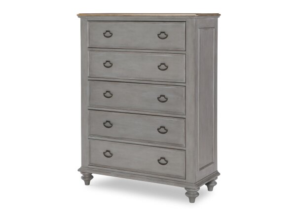 This five-drawer chest is made from Poplar solids and Spruce veneers with a two-tone Weathered White and Parchment Brown finish. It features soft-closing drawer guides, a premium felt-lined top drawer, and a cedar-lined bottom drawer.