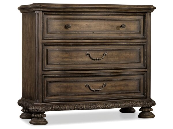 Traditional three-drawer bachelor's chest in a walnut-colored rustic finish with carved details. Includes a cedar-lined bottom drawer and a rear receptacle for electronics.