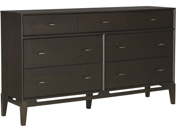 This sophisticated 9-drawer dresser, crafted from rubberwood solids and split heart white oak veneers, boasts a satin espresso finish with soft contemporary bow shaping and a starburst veneer top. It features soft-closing drawers, felt-lined top drawers,