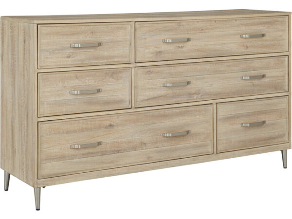 Seven-drawer dresser in light Desert Oak over white oak solids and veneers with wire-brushing and cerusing. Features a jewelry tray and two cedar-lined drawers with brushed brass bar hardware.