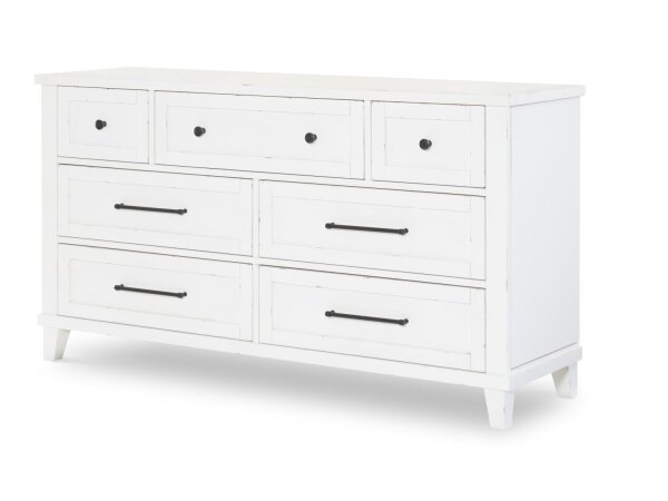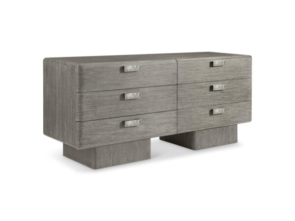 Seven-drawer dresser in light Desert Oak over white oak solids and veneers with wire-brushing and cerusing. Features a jewelry tray and two cedar-lined drawers with brushed brass bar hardware.