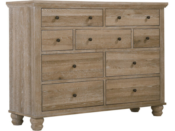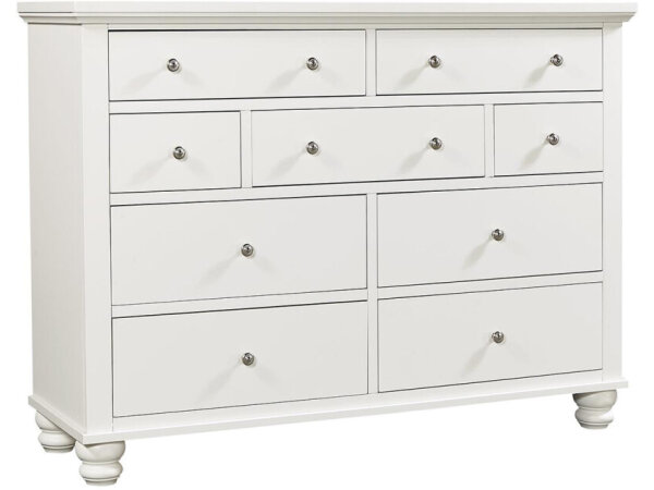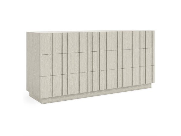 Two-tone dresser with six self-closing drawers; felt-lined top drawers (right with removable jewelry tray) and cedar-lined bottoms. Pebble Beach lacquered burlap case with soft-white cast resin fronts and champagne pulls.