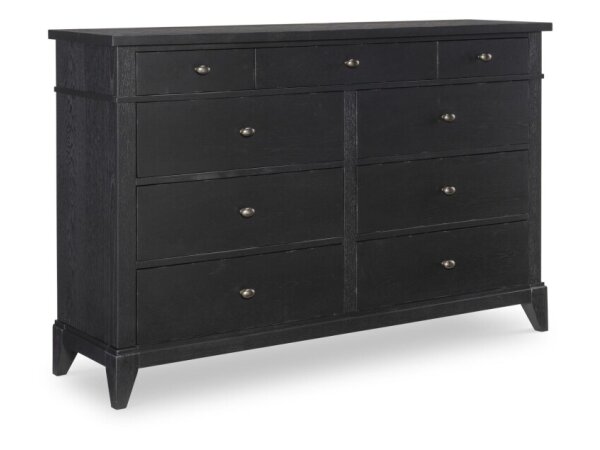 Seven-drawer wood dresser with neo-classic lines, cedar-lined bottom drawers, and a stepped top that evokes crown molding. Offered in semi-opaque colored finishes with bold ring pulls.