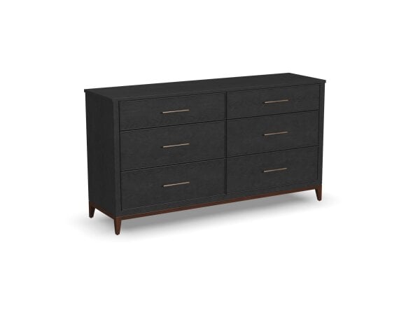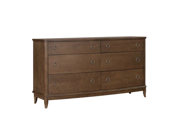 Six-drawer dresser with clean lines, carved rosettes, and tapered legs in elm veneer. Soft-close drawers feature Antique Pewter ring pulls and matching ferrules; distressed, glazed finish highlights the grain.