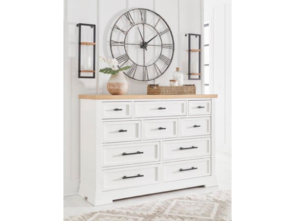 This 7-drawer dresser blends European Traditional design with a weathered brown whitewash top and antique white finish. It offers varied storage with different sized drawers, featuring felt-lined top drawers, cedar-lined bottom drawers, and full extension