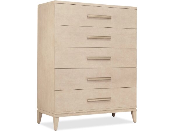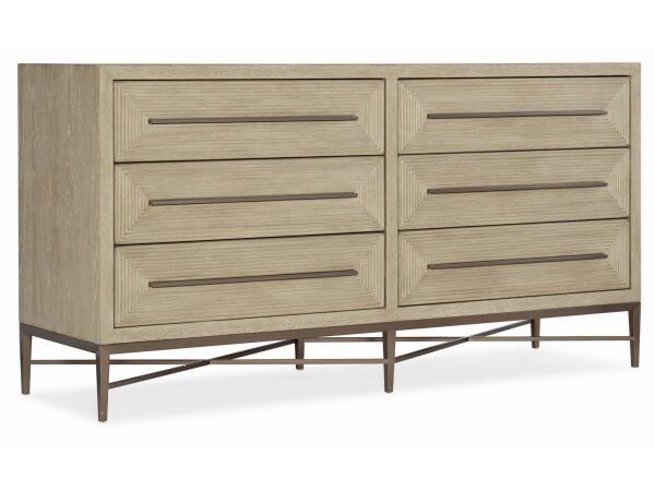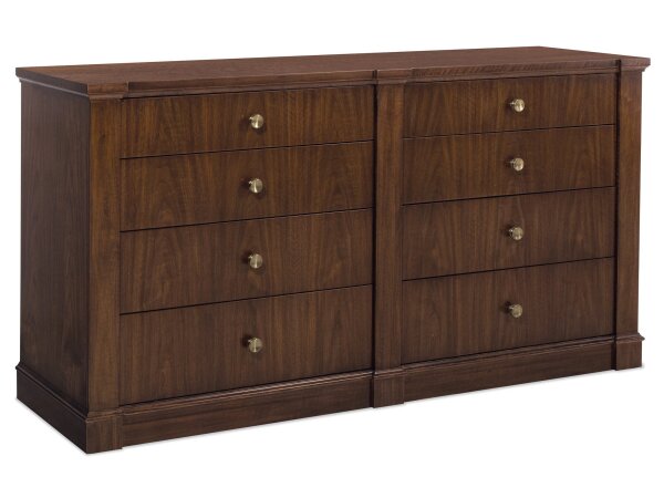 This Paradise Valley chesser is made from Rubberwood solids and Split Heart White Oak veneers with a Saddle Brown finish. It features ten soft-closing drawers, including felt-lined top drawers and cedar-lined bottom drawers, offering versatile storage.
