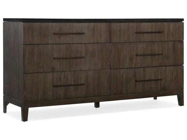 This South Bend 6-drawer dresser, crafted from Rubberwood solids and White Oak veneers with a Burnished Clay finish, combines modern design with practical features. It includes felt-lined top drawers, cedar-lined bottom drawers, and soft-closing drawer gu
