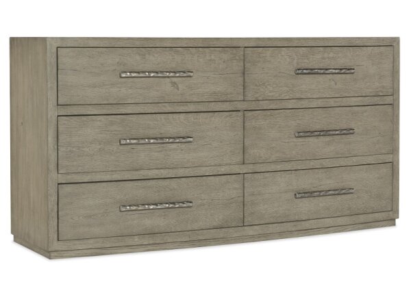 This South Bend 6-drawer dresser, crafted from Rubberwood solids and White Oak veneers with a Burnished Clay finish, combines modern design with practical features. It includes felt-lined top drawers, cedar-lined bottom drawers, and soft-closing drawer gu