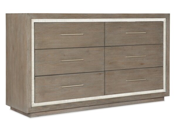 This 10-drawer chesser blends traditional and modern styles with a Whitestone finish, heavy distressing, and antique pewter hardware. Crafted from rubberwood solids, it features felt-lined top drawers, cedar-lined bottom drawers, and full-extension wood-f