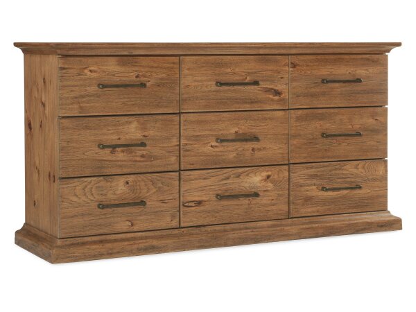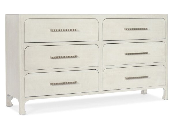 This 10-drawer chesser blends traditional and modern styles with a Whitestone finish, heavy distressing, and antique pewter hardware. Crafted from rubberwood solids, it features felt-lined top drawers, cedar-lined bottom drawers, and full-extension wood-f