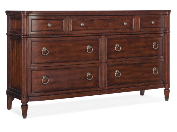 Seven-drawer dresser in a dark wood finish, crafted from cherry and okoume veneers with walnut inlay and olive ash burl, plus metal ferrules and a solid-wood edge top. Traditional Charleston styling for organized bedroom storage.