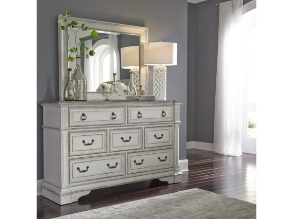 This Abbey Park 7-drawer dresser features European traditional design with an antique white and weathered brown finish on rubberwood solids. It provides ample storage across three different drawer sizes, complete with full extension glides and felt-lined